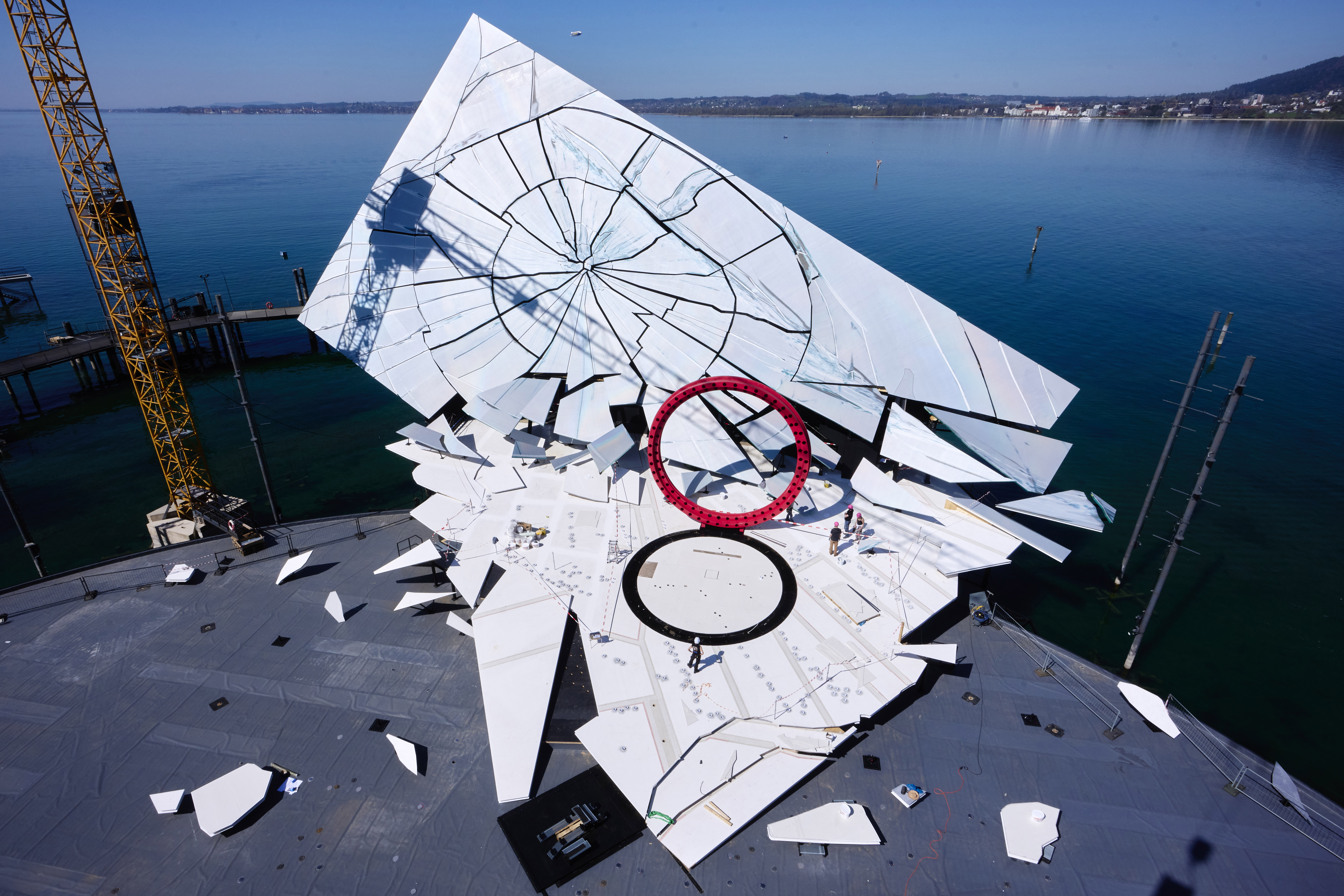 Nach und nach ist das Bühnenbild für La traviata in den vergangenen Monaten aus den Winternebeln am See gewachsen: ein schillernder Spiegel mit den enormen Maßen von 700 Quadratmetern Fläche und rund 28 Metern Höhe*, zerbrochen in 86 einzelne Teile – von winzig kleinen Splittern bis zu großen Bruchstücken, die teils gleichzeitig als ausklappbare Spielflächen dienen. Über die Hälfte der Spiegelsplitter können aktiv bewegt werden und zeichnen im Laufe der Aufführung symbolisch die Entwicklung der Hauptfigur Violetta nach, die an der oberflächlichen Pariser Gesellschaft seelisch und körperlich zerbricht.