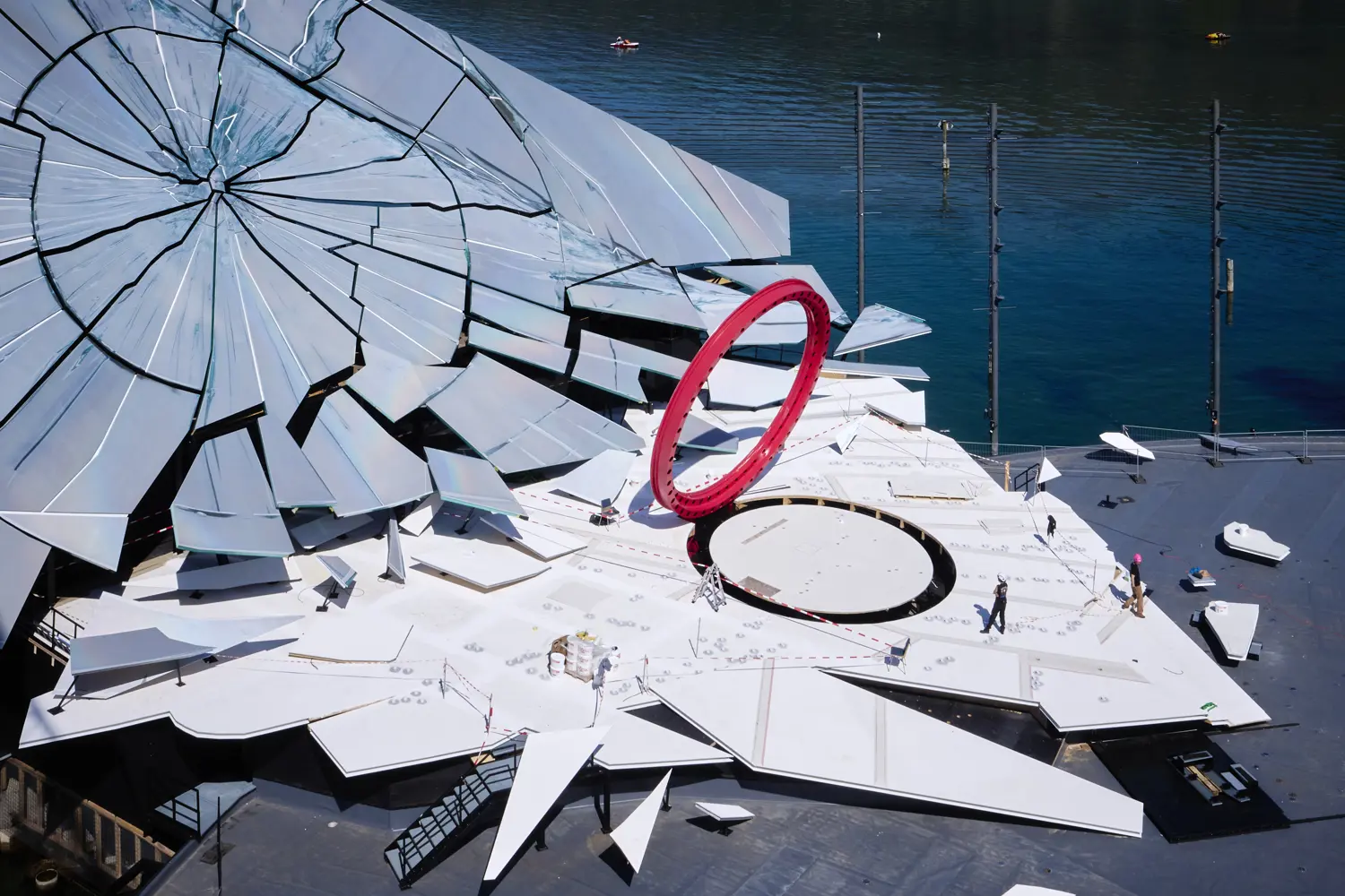 Bregenz, 08.04.2026. Imposant ragt er aus dem Bodensee: der riesige, zerborstene Spiegel, der den Hintergrund für Damiano Michielettos Inszenierung von La traviata bildet. Für das außergewöhnliche Bühnenbild des Opernklassikers von Giuseppe Verdi, der erstmals bei den Bregenzer Festspielen zu sehen sein wird, zeichnet Paolo Fantin verantwortlich. Premiere auf der Seebühne ist am 22. Juli 2026.