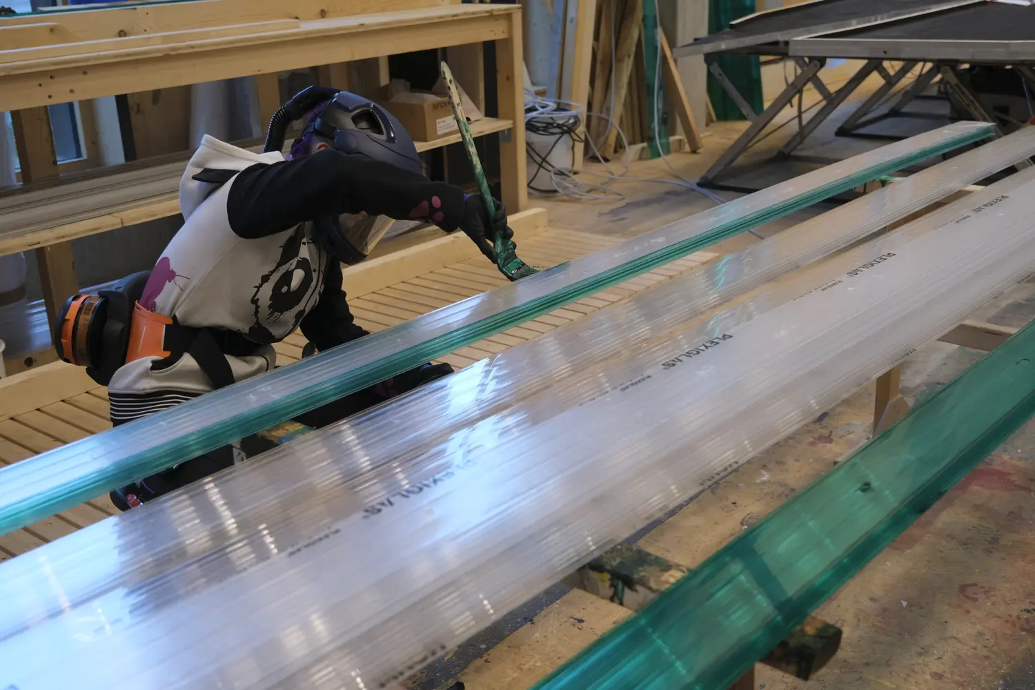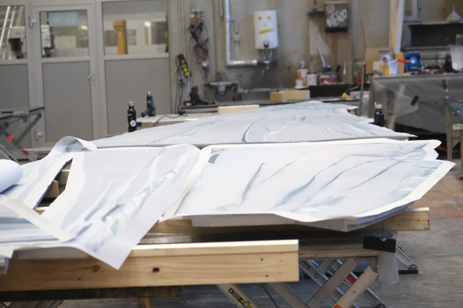 In der Montagehalle des Festspielhauses fertigt das Festspiel-Kaschur- und Technikteam schon seit dem Herbst 2025 die großen und kleinen Spiegelsplitter an: aus CNC-gefrästen Holzplatten, bedrucktem Gewebe sowie grün lackierten Stegplatten an den sichtbaren Kanten.