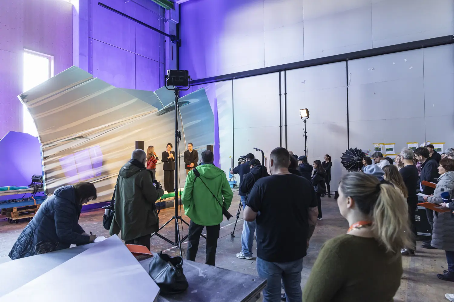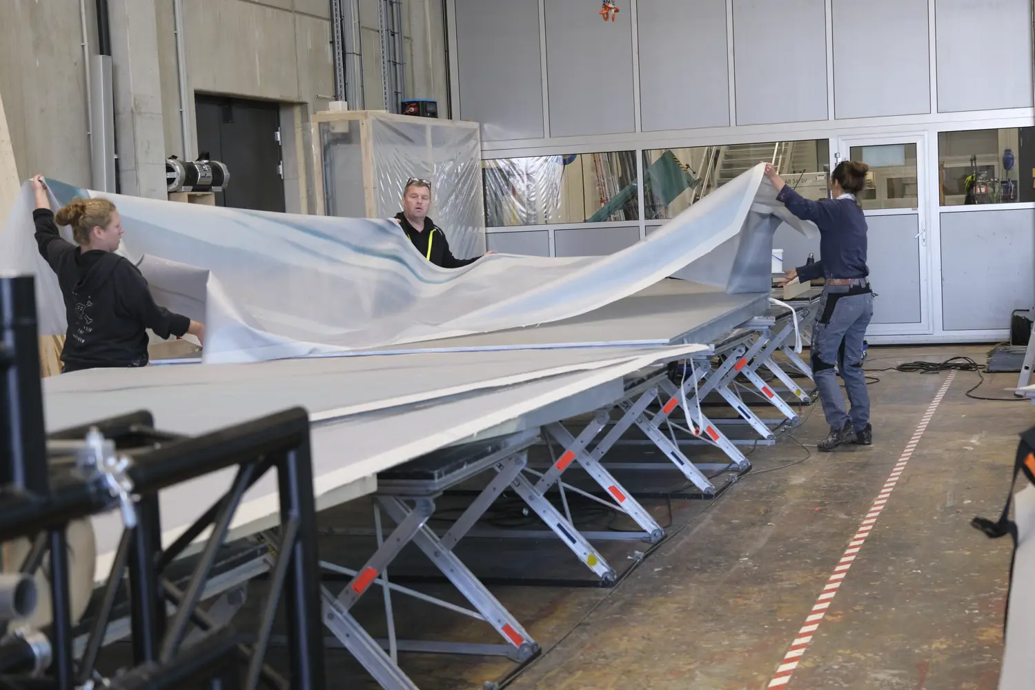 Bregenz, 05.02.26. Auf der Seebühne der Bregenzer Festspiele nimmt Giuseppe Verdis La traviata, das Spiel auf dem See 2026/27, zunehmend Gestalt an. In der Montagehalle arbeitet das Kaschur- und Technikteam derzeit an der 700 Quadratmeter großen Spiegelwand, dem zentralen Element des Bühnenbilds.