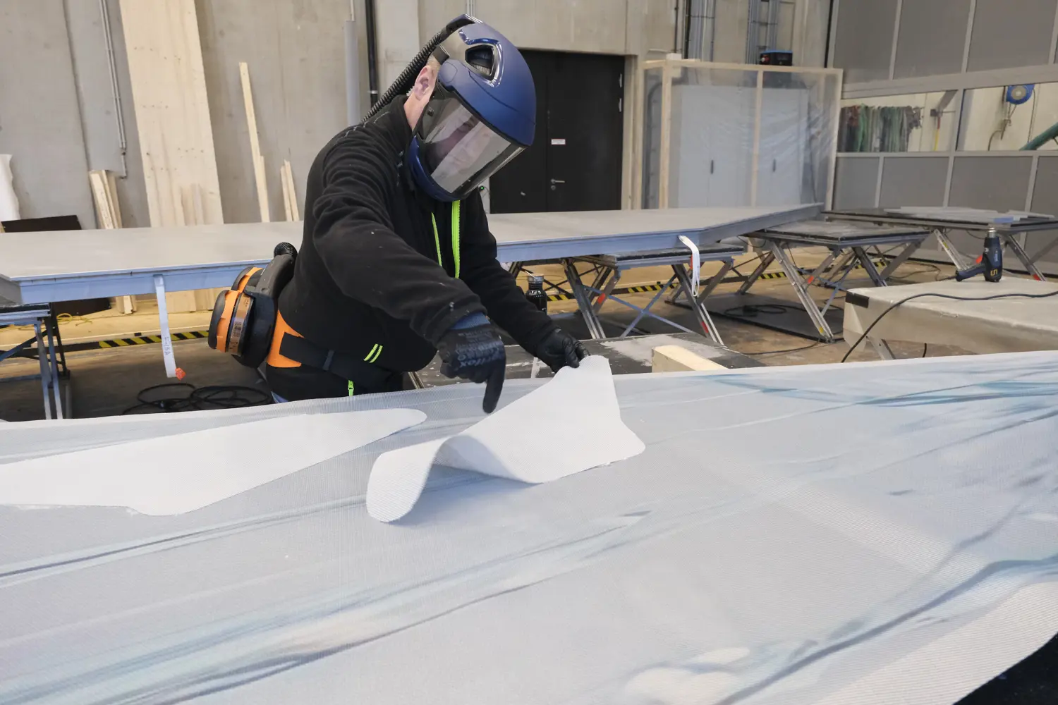 Um das Gewebe auf den Holzplatten zu befestigen, kommt ein in der textilen Möbelverarbeitung gebräuchlicher Klebstoff zum Einsatz. Dafür hat man gemeinsam mit externen Partnern eine eigene Maschine entwickelt, mit der der Klebstoff gleichmäßig auf die jeweils mehrere Quadratmeter großen Flächen aufgetragen werden kann. Erst wenn das Gewebe exakt positioniert ist, wird der Klebstoff mithilfe in die Maschine integrierter Heizstrahler aktiviert und so dauerhaft fixiert.